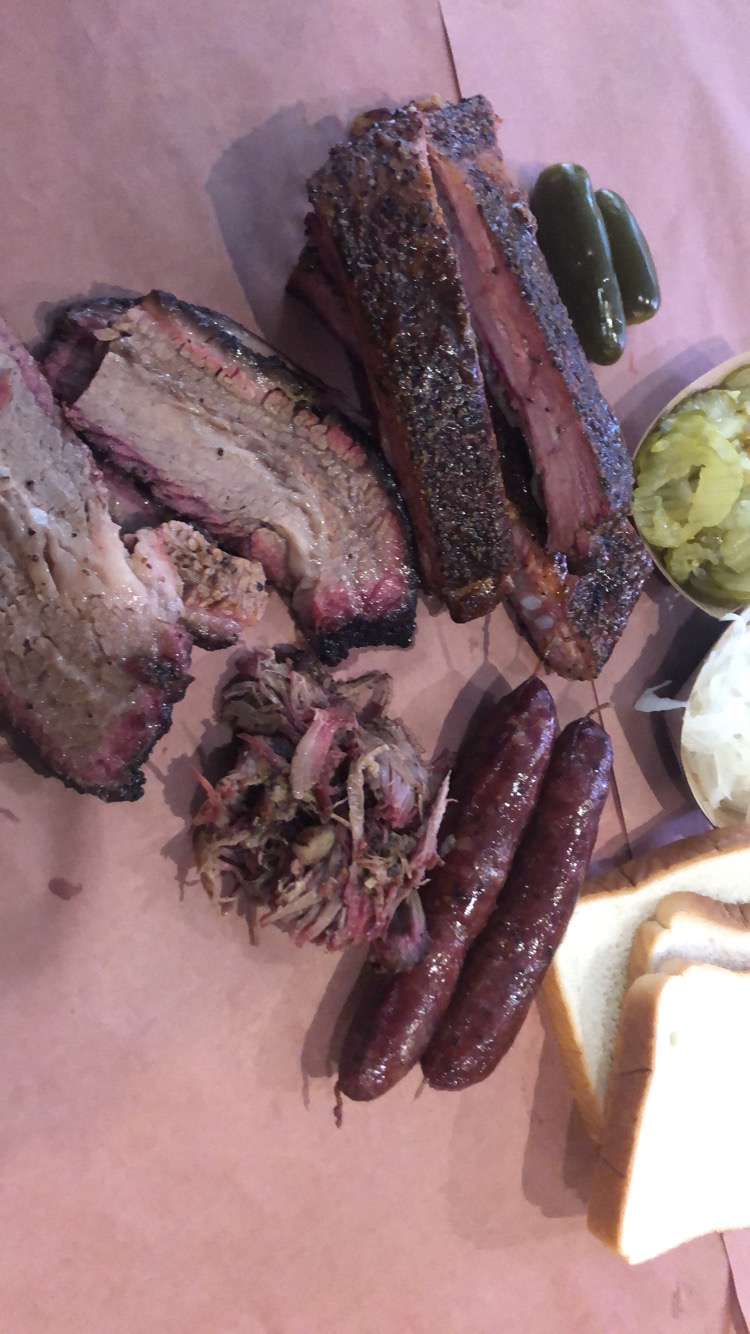 After sleeping off breakfast tacos, I got up and got dressed for my date with Franklin Barbecue. I heard the line quickly wraps around the building so I knew I would try to get there before the lunch/church crowd. When I did arrive, there was already a trail beginning. Tents and bikes were gathered on the property from where campers had waited their turn. The ramp, going inside, was snaked around with people standing like dominoes. They even had an employee standing outside making progress updates. I waited in line for 45 minutes (very much worth it) and the only thing sold out was turkey, which wasn’t initially on my mind until I heard it was sold out. Means it has to be good, right? As soon as you step one foot inside the door, the amazing smell hits your nostrils and you see memorabilia available for purchase. I ended up getting everything else. Brisket, pulled pork, sausage and ribs filled my tray as the meat cutter finished butchering a freshly pulled out slab of ribs and a whole brisket. The brisket was juicy and super tender- accompanied with the perfect smoke ring. Both lean and fatty cuts were excellent but the fatty cuts provided more flavor and juice, while not being overly fatty. Ribs slid smooth off the bone and also carried that awesome smoke flavor. The pulled pork was given to me as a sample. Typically, when I try pulled pork it’s still extremely salty… not at Franklin. The smoke and salt flavors actually complimented each other- the perfect pork for a pulled pork sammie! And the sausage was delicious with that slight snap/crunch from the outer layer of the skin. I literally had no complaints and a small little wrapped up doggy bag to take home. I’ll definitely be back for you Franklin 🙂