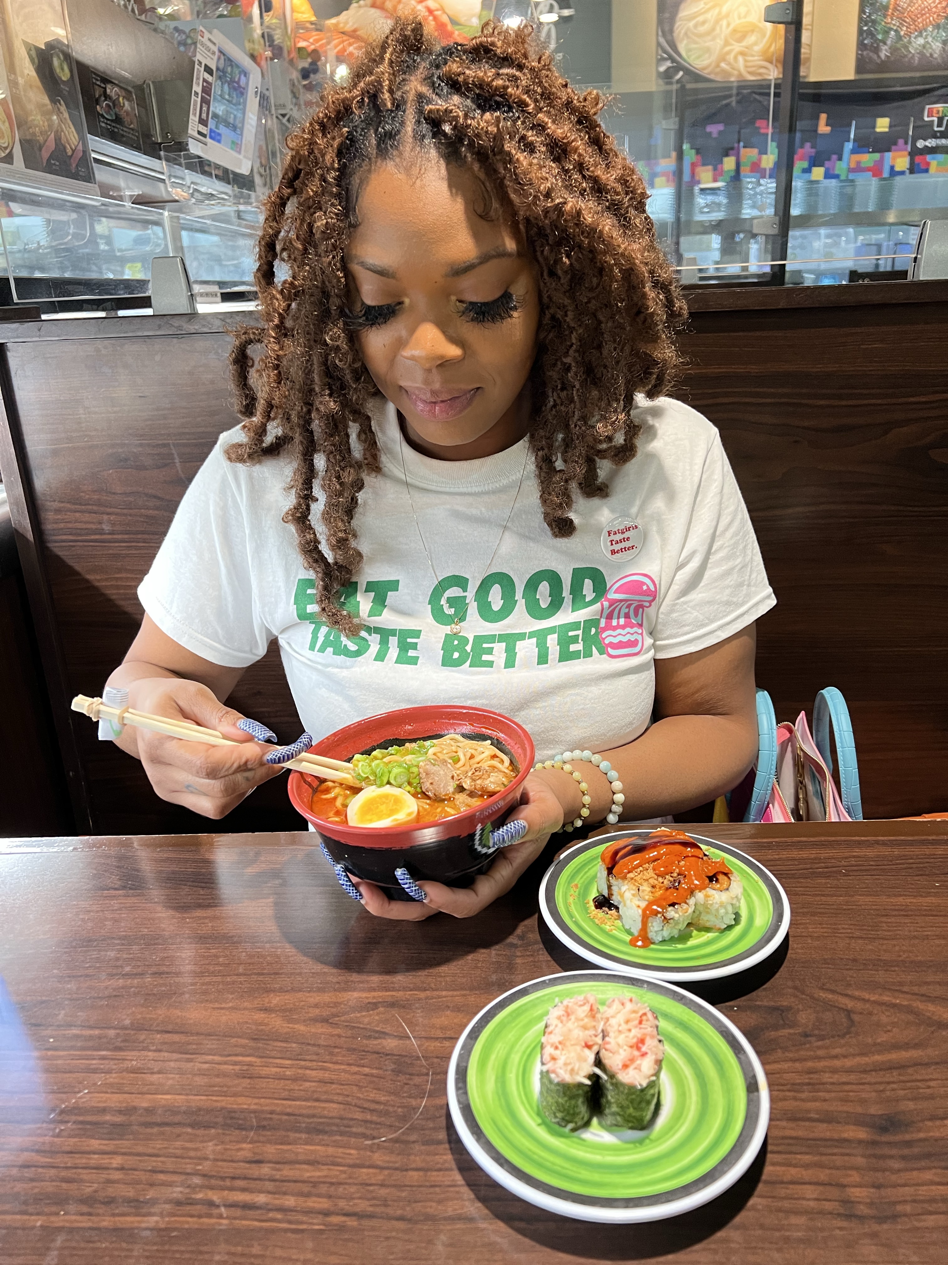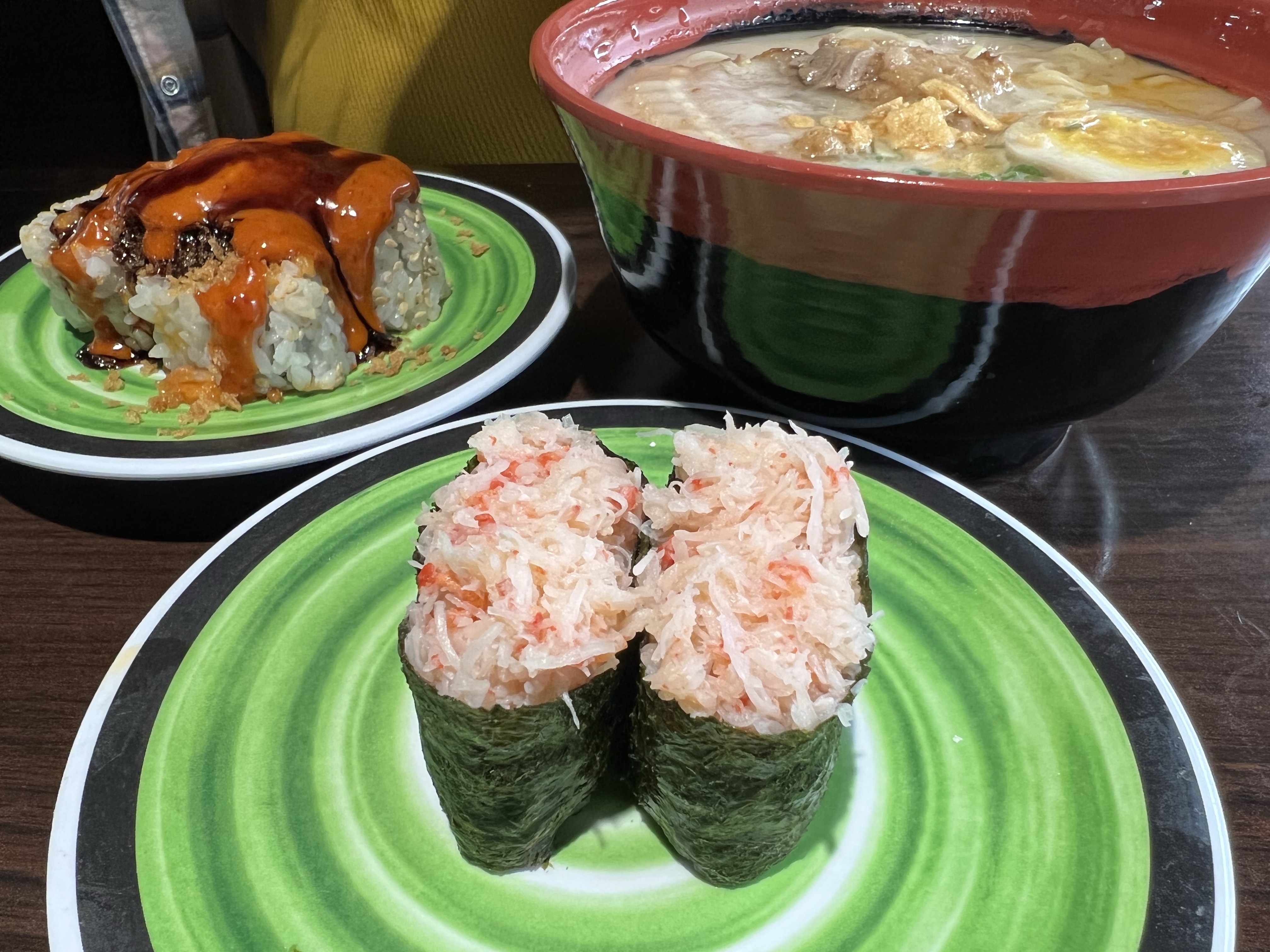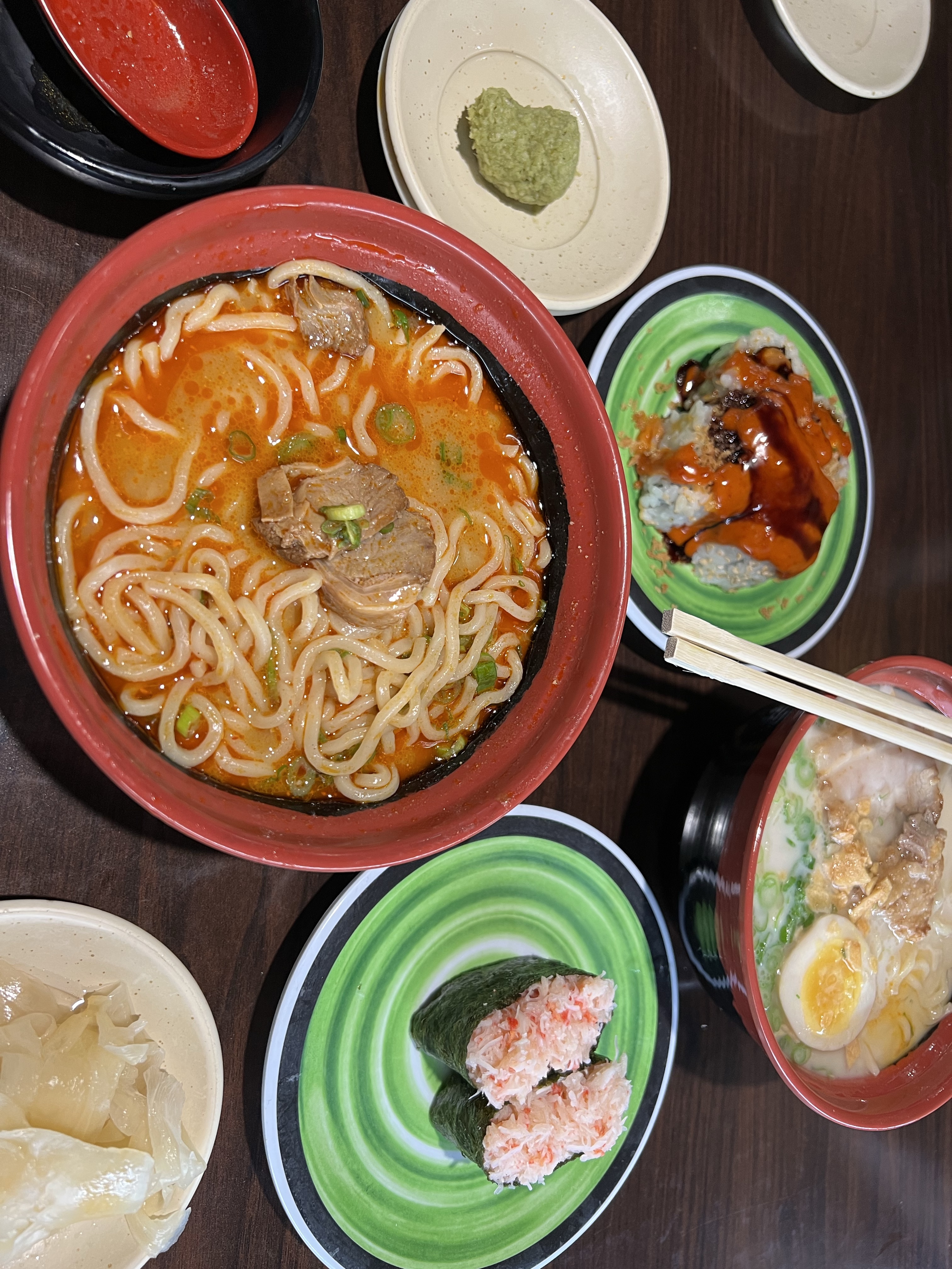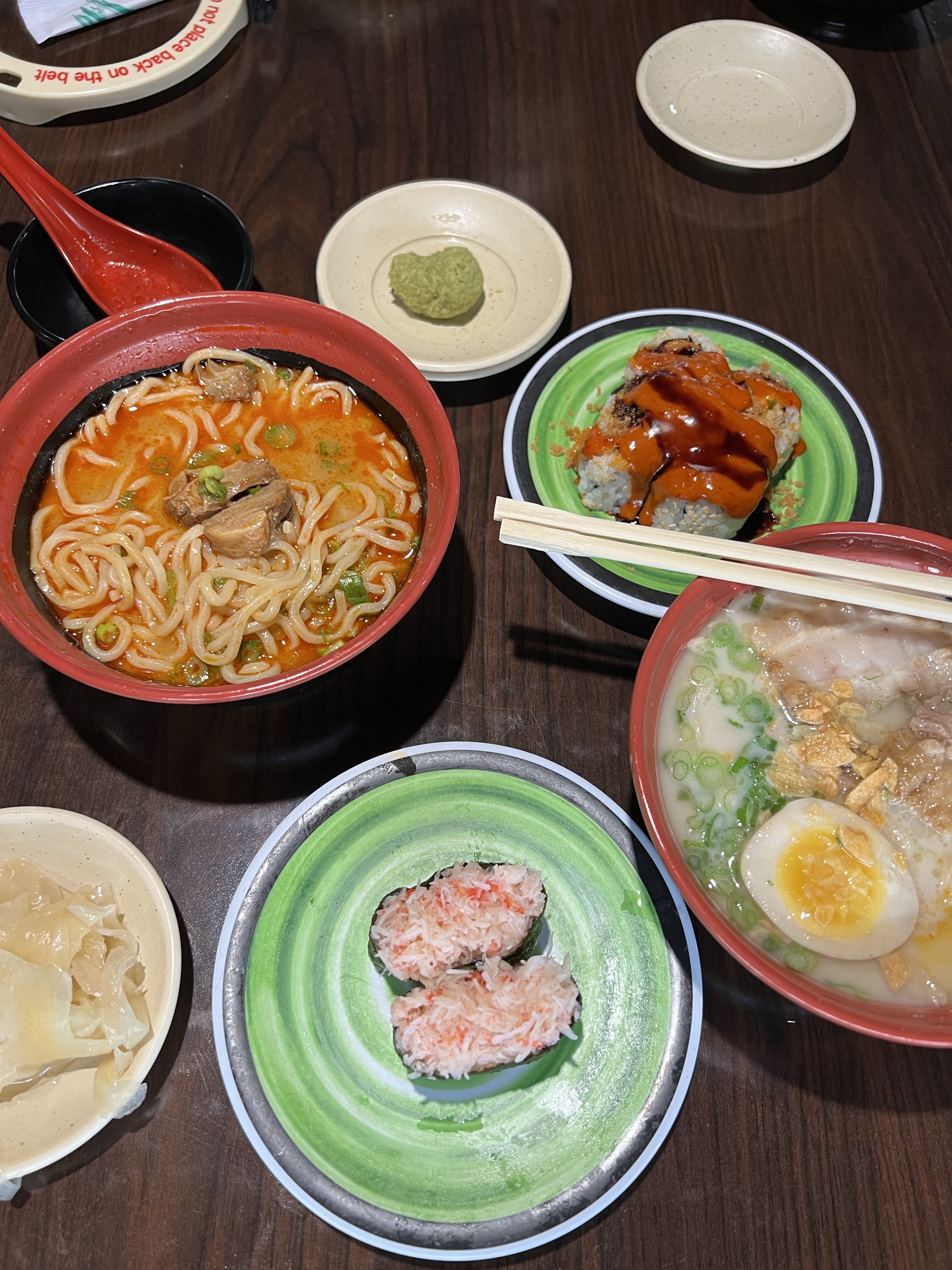 We walked in and seated after digitally checking in. It took quite some time for waters to be brought out and the sushi bar was probably about halfway filled up as we watched the conveyor belt rotate. I spotted the Real Crab Meat Gunkan and knew it was going to be tasty. However, the real reason I was there was for Ramen! I reviewed all of the ramen choices, which to my surprise were ALL pork. Quick piggy spill: I try not to eat pork often. I love bacon (a major hang-up for me), but that’s about it. So when I get ramen at every single other place I love ramen from, it’s usually chicken or shrimp. So I browsed the menu and saw that they had plenty of meat options on the menu like crispy chicken, all kinds of tempuras… hell even yellowtail cheek! I pressed the button to alert the server that we needed her. A young girl came and told me that they couldn’t change the meat, which definitely left me a little salty and perplexed. I ordered the Tantanmen and slid a crab sushi plate off the belt. Amanda ordered the Tonkotsu + Salmon Golden Crunchy Roll.