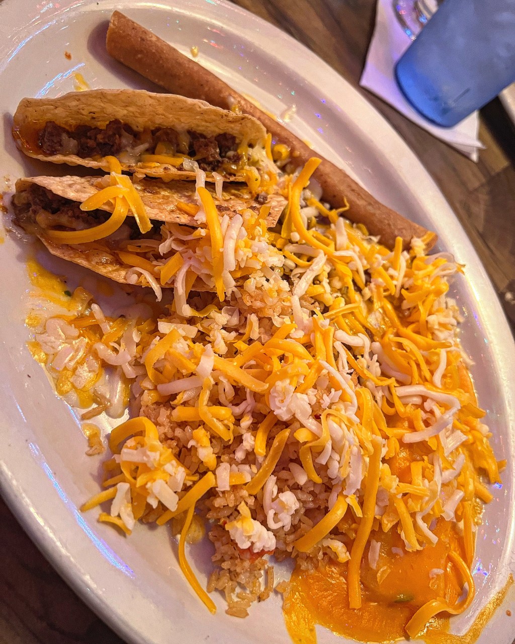 She also could not recommend anything on the menu. First red flag. We then asked a busser about recommended bites and his two suggestions were simple, quesadillas and bacon-wrapped shrimp. Second red flag. We can see where this is headed. Eventually, my lemonade came out and a syrup-y margarita as well. Their housemade cheese sauce was swirled on the table with chips and salsa. Certainly, the cheese sauce would be good, but nope. Completely watered down, processed, bland and used repetively throughout the menu on other items like the cheese enchiladas. Which came on my Lunchita Combo Plate accompanied by a chicken flauta, and two mini beef tacos plus, rice and beans. The tacos and flauta tasted decent. The tortilla for the flauta had no flavor and was thin, followed up my unseasoned, dry chicken meat. The tacos had a good crunch but no one is seasoning the meat (or anything) here! And I just cant! This was by far the worst meal I ate in 2021.