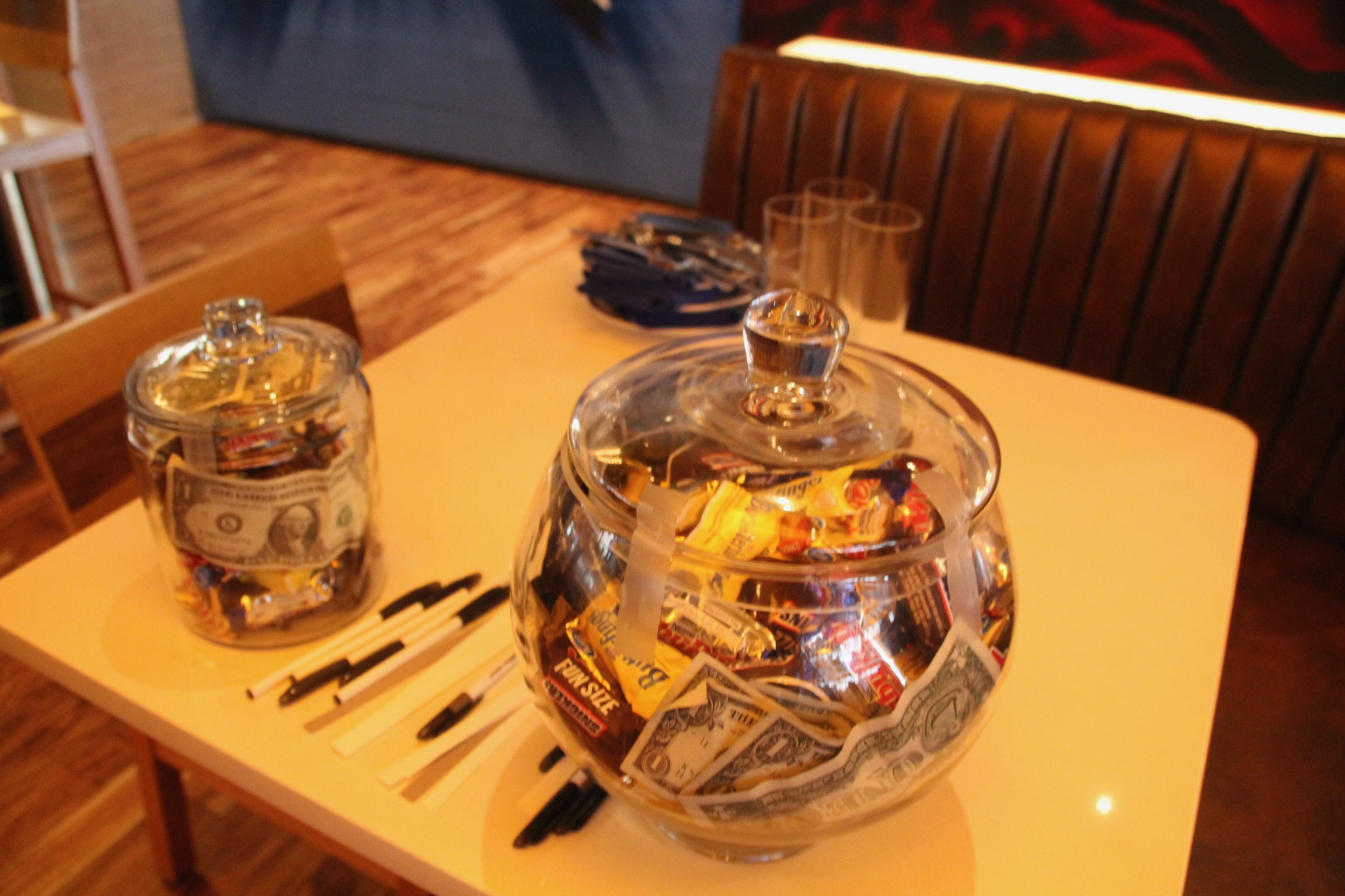 Once I got in, the hostess walked me over to my reserved dining area and I met my waitress, Alyssa, who was AMAZING. She was able to make recommendations and help me setup. She was all around a great server and we were happy to have her. Menus were laid out on the table and I placed my “Find the Guest” print outs from PlanPrintandParty on Etsy. If you’ve never played “Find the Guest”, Every guest gets a checklist where they have to find someone who has a certain characteristic and have to mingle to find another guest who fits each point on the checklist. I also bought apothecary jars and stuffed them with cash and good chocolates like Snickers, Hershey, and Butterfinger to play the guessing game. I wanted my attendees to be entertained with more than just conversation and good company.