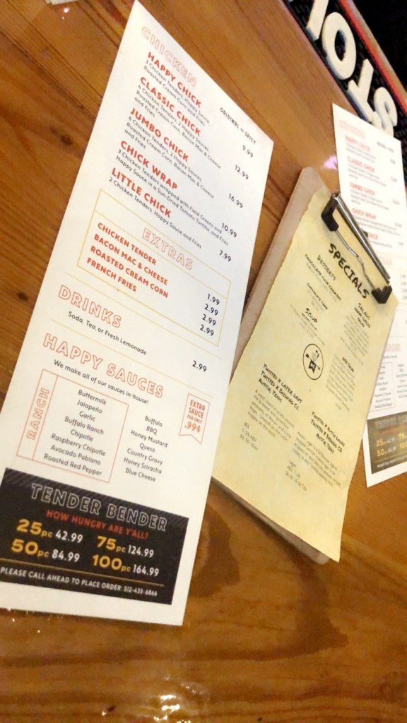 That night I headed to 6th Street in the Entertainment District. 6th can be an adventure of its own. You’ll see plenty of Austin’s weirdest there. But you’ll also get awesome food, like Happy Chicks. Snuggled in between San Jacinto Blvd. and Brazos, on 6th St. you’ll find some of the sexiest tenders you can eat. Fried to perfection with a slight crunch from a flour coating. Plus, I asked for half regular and spicy. And can I say 🗣 ROASTED 👏🏽CREAM👏🏽CORN👏🏽! The corn gods granted me inner divinity. Scratch-made cream corn with a kick… oh yes! It’s like a bowl of corn soup. Very rich and creamy but not thick. It’s definitely slurp-able like soup, for sure. If you want something magical to happen… dip your tender in the corn soup juice!! 🤯 Plus they have more sides to choose from. The freshly made lemonade was pretty stellar too. They offer a variety of Happy Sauces in 2 categories: ranch and classic. Both with a pretty decent selection of sauces. I really enjoyed the garlic and jalapeño. But seriously, the corn, don’t sleep on it… it’s freakin awesome. It’s drink out of a boot worthy.