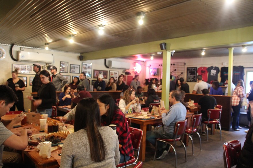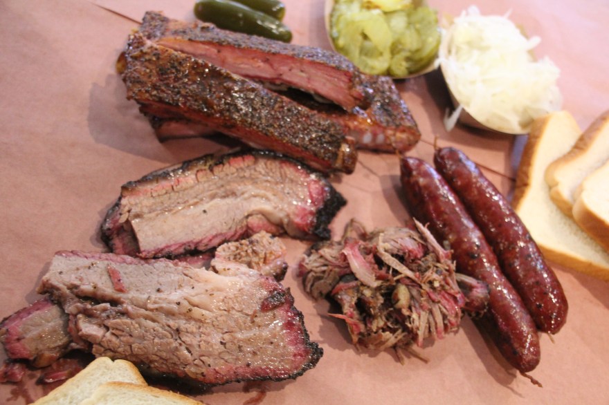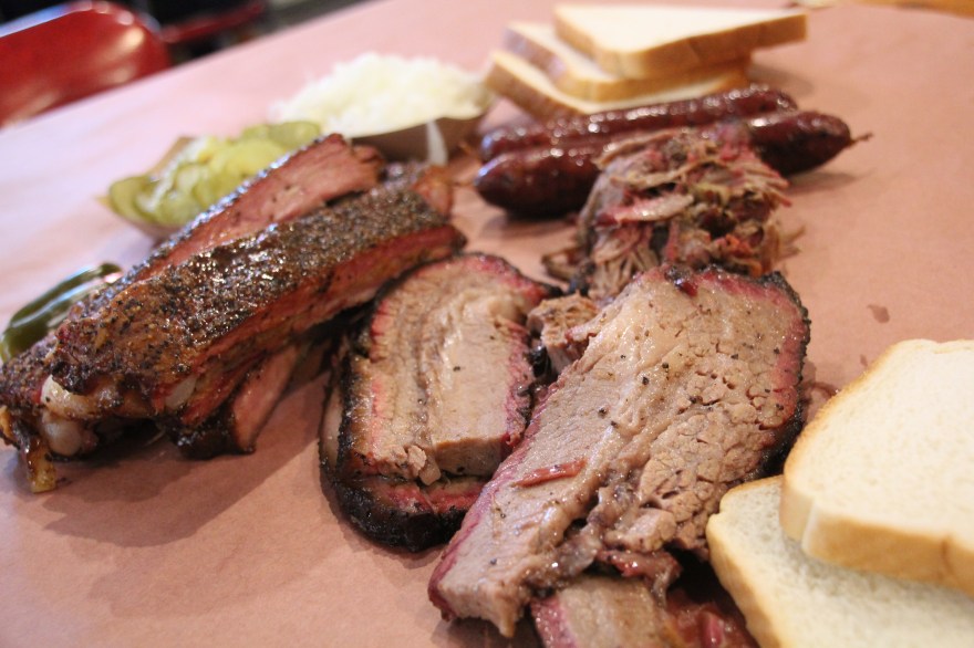After sleeping off breakfast tacos, I got up and got dressed for my date with Franklin Barbecue. I heard the line quickly wraps around the building so I knew I would try to get there before the lunch/church crowd. When I did arrive, there was already a trail beginning. Tents and bikes were gathered on the property from where campers had waited their turn. The ramp, going inside, was snaked around with people standing like dominoes. They even had an employee standing outside making progress updates. I waited in line for 45 minutes (very much worth it) and the only thing sold out was turkey, which wasn’t initially on my mind until I heard it was sold out. Means it has to be good, right? As soon as you step one foot inside the door, the amazing smell hits your nostrils and you see memorabilia available for purchase. I ended up getting everything else. Brisket, pulled pork, sausage and ribs filled my tray as the meat cutter finished butchering a freshly pulled out slab of ribs and a whole brisket. The brisket was juicy and super tender- accompanied with the perfect smoke ring. Both lean and fatty cuts were excellent but the fatty cuts provided more flavor and juice, while not being overly fatty. Ribs slid smooth off the bone and also carried that awesome smoke flavor. The pulled pork was given to me as a sample. Typically, when I try pulled pork it’s still extremely salty… not at Franklin. The smoke and salt flavors actually complimented each other- the perfect pork for a pulled pork sammie! And the sausage was delicious with that slight snap/crunch from the outer layer of the skin. I literally had no complaints and a small little wrapped up doggy bag to take home. I’ll definitely be back for you Franklin 🙂