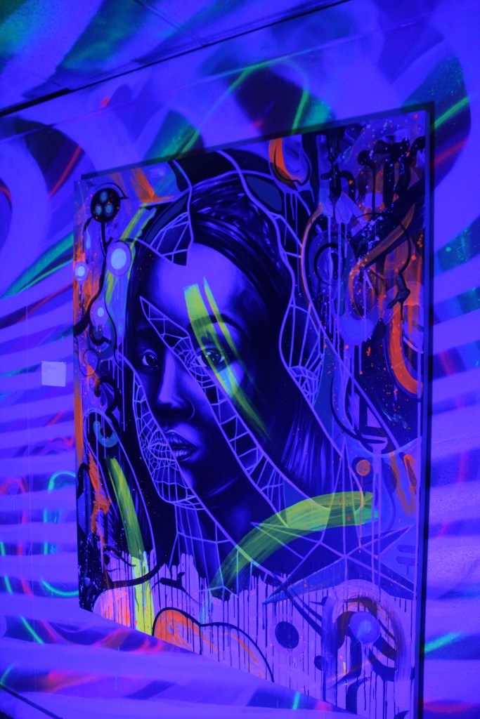 Along with your purchased ticket, you also get a free drink ticket to get yo’ drank on! This leads us up the stairs to the bar and, where you can find some more of the art I mentioned earlier. Sparkling Ice teamed up with PR to get the drinks popping, but I opted for an ice cold Stella Artois.