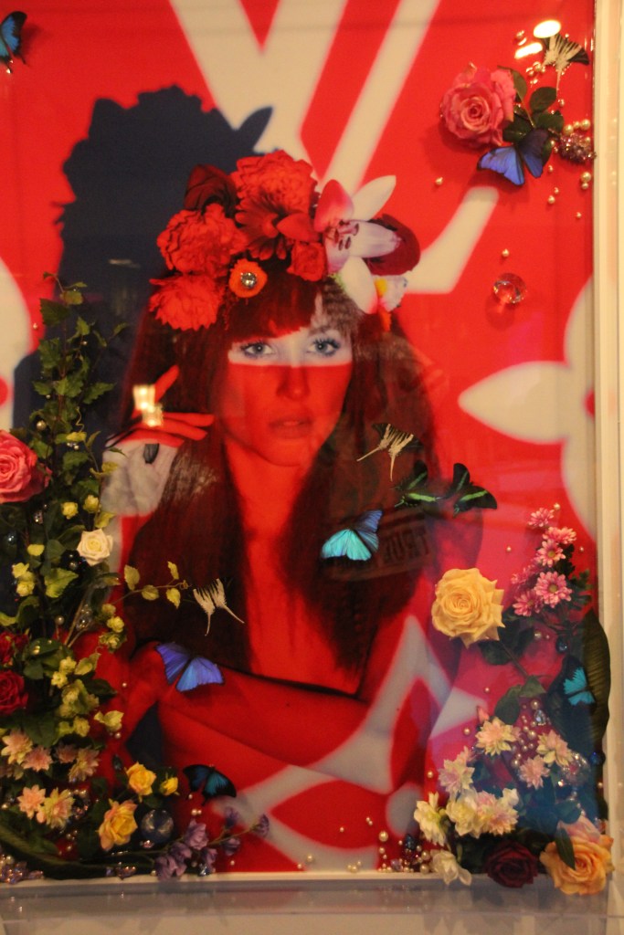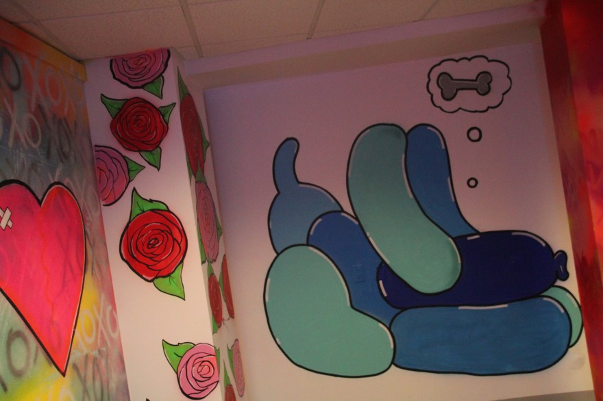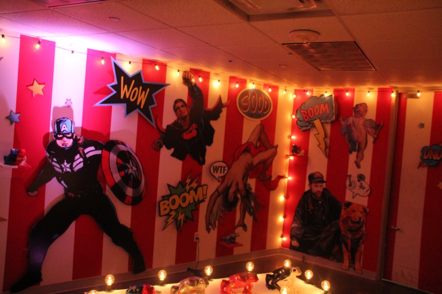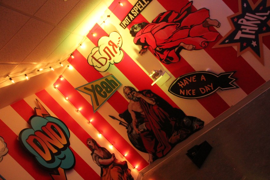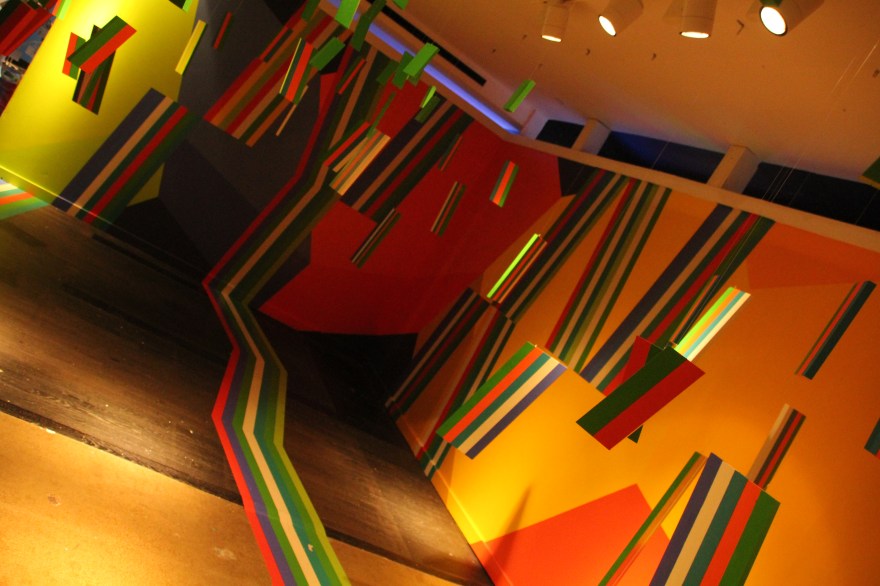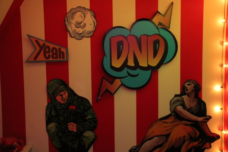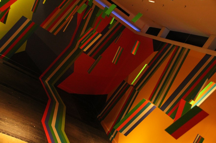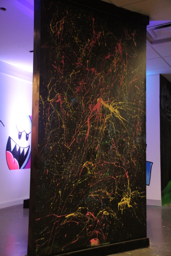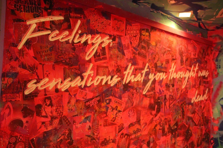 You begin walking down a hallway filled with portraits hanging on the wall. Then the rooms switch to a superhero cartoon-esque area, another with metal butterfly wings glowing from fuchsia lights shining on them, floating planks lined in multiple colors in the next section you step in, a spray paint room, a pink piano in the lobby that’s not fully functional, an awesome red sheer curtain area that makes for a very sultry scene plus more. Each section has it’s own distinctive feel and use of art techniques and forms like pop culture, contemporary, bold colors, abstract, murals, photography and conceptual pieces are all here. My favorite piece was the Tree of Random Thoughts (I don’t know if that’s really the name, but it totally fits)! Limb after the limb, the leaves of this wordy tree belong to the person before you, who decided to leave their 2 cents behind. I think the tree stuck with me because everyone has the opportunity to interact with this piece. There are small postcards with glitter on one side and blank on the other. Pens to write and chenille stems to hang your written thought up.