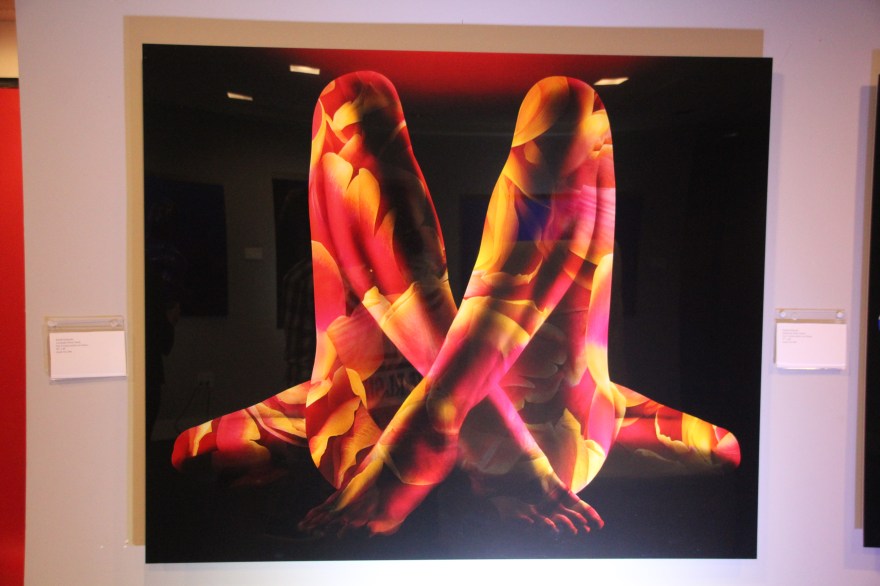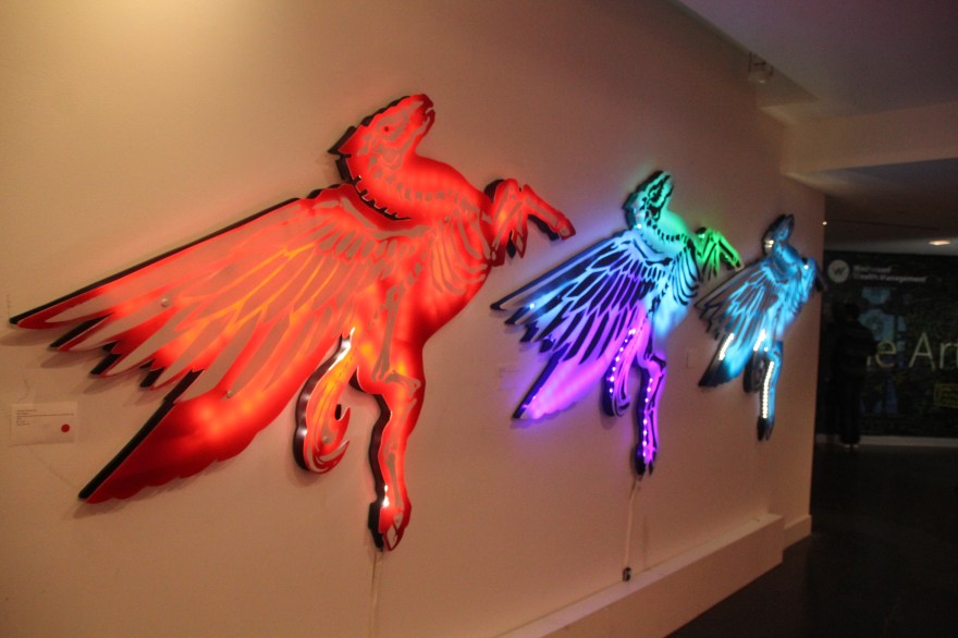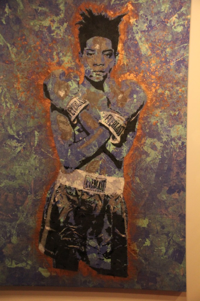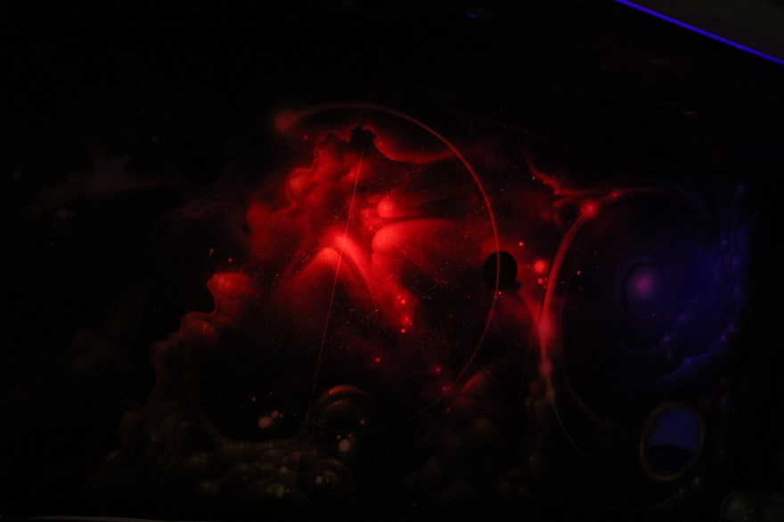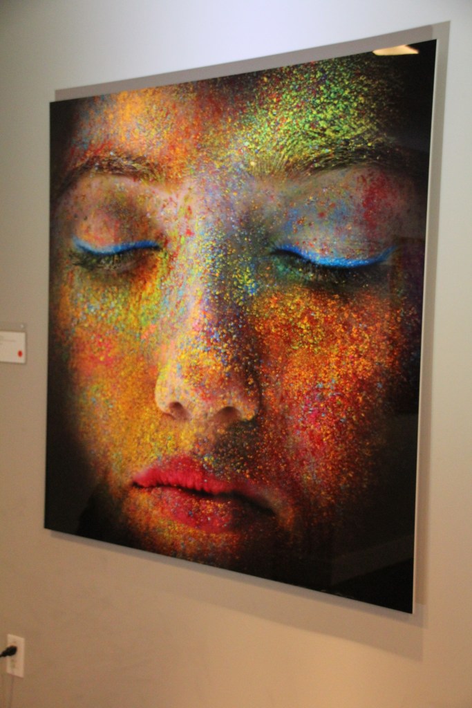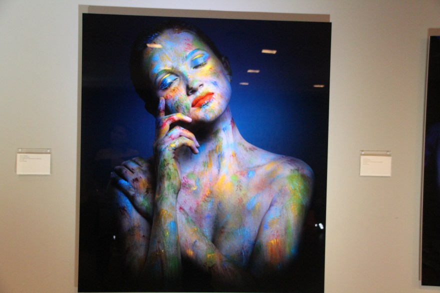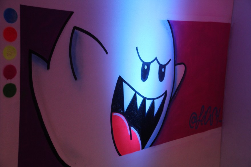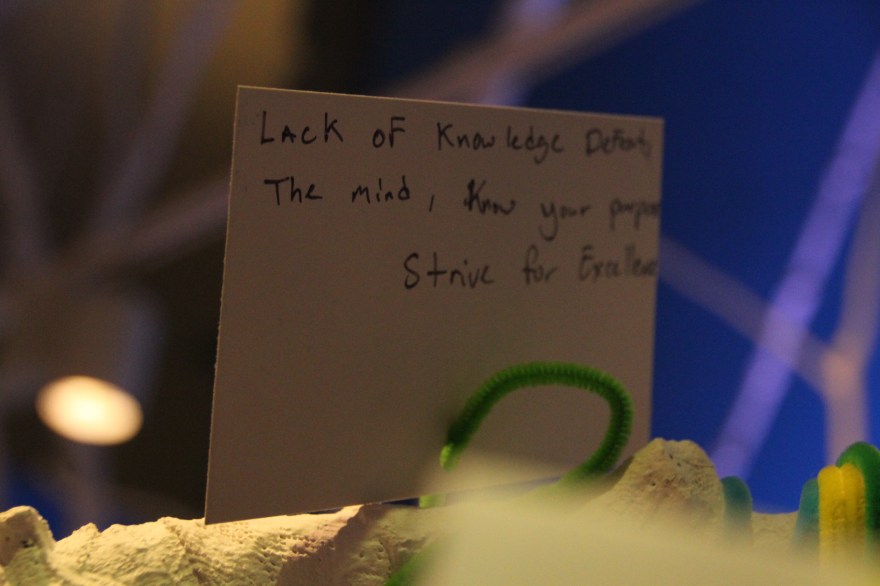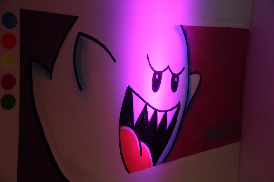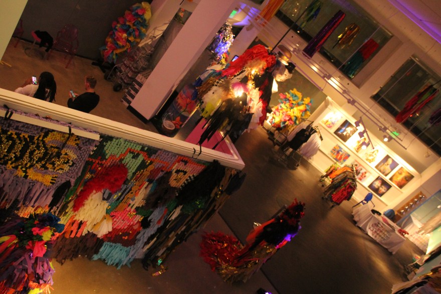 You begin walking down a hallway filled with portraits hanging on the wall. Then the rooms switch to a superhero cartoon-esque area, another with metal butterfly wings glowing from fuchsia lights shining on them, floating planks lined in multiple colors in the next section you step in, a spray paint room, a pink piano in the lobby that’s not fully functional, an awesome red sheer curtain area that makes for a very sultry scene plus more. Each section has it’s own distinctive feel and use of art techniques and forms like pop culture, contemporary, bold colors, abstract, murals, photography and conceptual pieces are all here. My favorite piece was the Tree of Random Thoughts (I don’t know if that’s really the name, but it totally fits)! Limb after the limb, the leaves of this wordy tree belong to the person before you, who decided to leave their 2 cents behind. I think the tree stuck with me because everyone has the opportunity to interact with this piece. There are small postcards with glitter on one side and blank on the other. Pens to write and chenille stems to hang your written thought up.